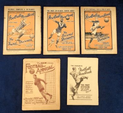 Football Giveaways, five giveaways, Football Favourite Football Handbooks 1925/26 comprising Part 1 English & Scottish First Division, Part 2, English & Scottish Second Division & Part 3, English Third Division (North & South Sections), sold with The Favourite Football Handbook First Division 1927/28 & The Gem Library Annual 1920/21 which includes images of W Meredith, Aston Villa FA Cup Winning side, Woolwich Arsenal Team Group etc (some foxing & minor faults, gen gd)