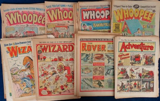 Comics, a selection of comics to comprise 14 x Whoopee (1976-80), 3 x Robin (Vol 1 1953), 15 x The Complete Fantastic Four (1977 and 78), 3x Wizard (1949, 50 and 62), The Rover (2 x 1950 and 2 x 1960), 3 x Adventure (2 x 1949 with stitch marks to spine and 1 x 1950), 3 x Super Spider-Man and the Titans (1976 and 77), 7 x Spider-Man (1974, 75 and 76), 40+ Eagle (1950s and 60s poor condition), 1 x Mickey Mouse (1976) (gd unless otherwise stated)
