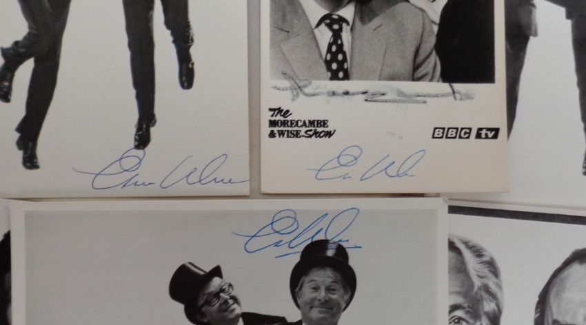 Entertainment, Eric Morecambe, from a sale of his possessions, a large qty (100s) of promotional photographs (much duplication), 3 signed by Morecambe and Wise and 3 signed by Wise. 9 booklets promoting the book 'The Best of Morecambe and Wise', a selection of letters from celebrities and promoters etc. to include Jimmy Hill, Dickie Henderson, Michael Grade, Nicholas Parsons and many more (gd)