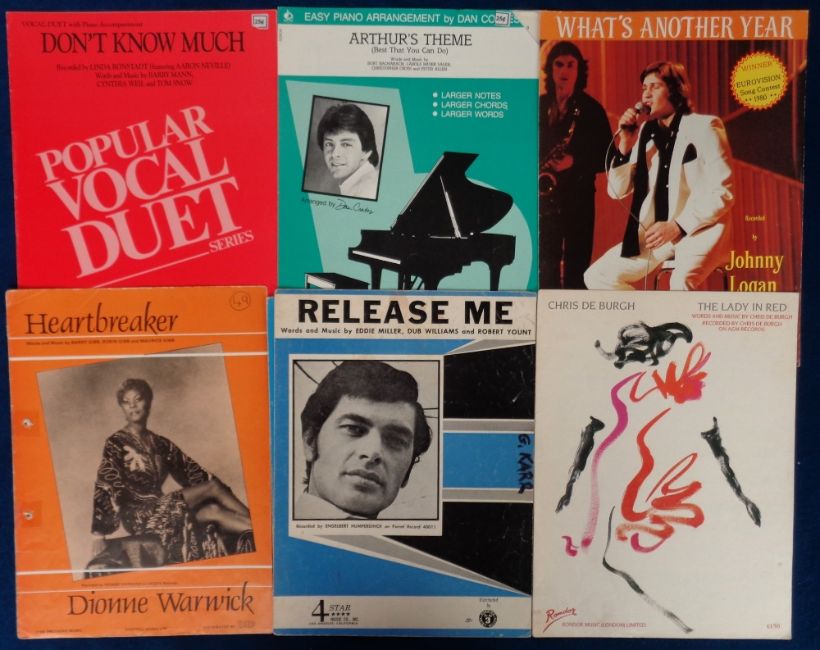 Entertainment, approx. 350 items of sheet music to include Paul Simon, Barry Manilow, Three Lions, Russ Abbot, Puff The Magic Dragon, Art Garfunkel, Wings, Tony Christie/Peter Kay, Frank Sinatra, Gloria Gaynor, Dionne Warwick etc. (mixed condition, gen gd)