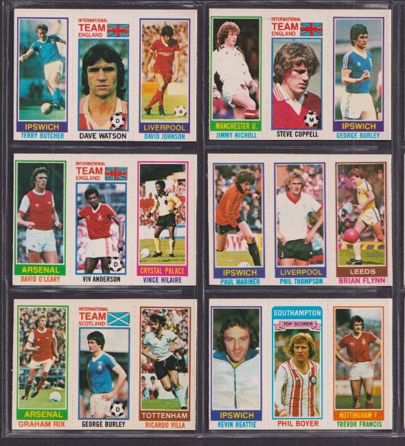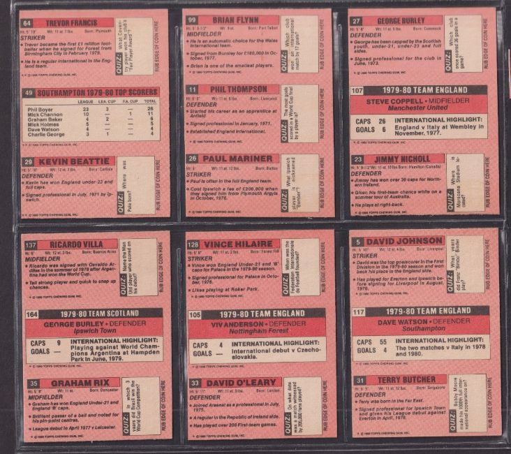 Trade cards, Topps Football, 2 sets 1979/80 (Pink back, set 66 strip of 3 cards) & 1980/81 (Blue back, set 65 strip of 3 cards) (vg)