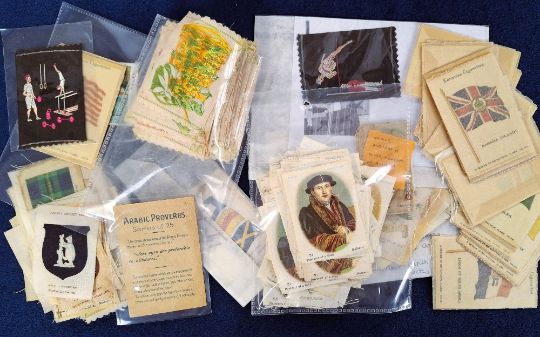 Tobacco silks, mixture a few hundred silks in small box, Wills Australian Wild Flowers (16 with original backs) Morris English Flowers (approx. 25 without backs), Over 50 Kensitas Flowers without folders, Kensitas Flags, Phillips Old Masters, Phillips County Cricket badge (1) and many more (some fraying gen gd a few fair)