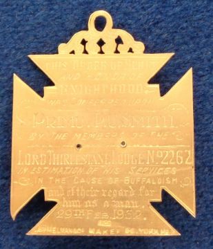 Masonic Gold Jewel, Royal Antediluvian Order of Buffaloes 9ct gold Order of Merit presented by the Lord Thirlestane Lodge in 1952. Total weight approx. 14.78g (gd/vg)