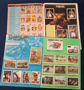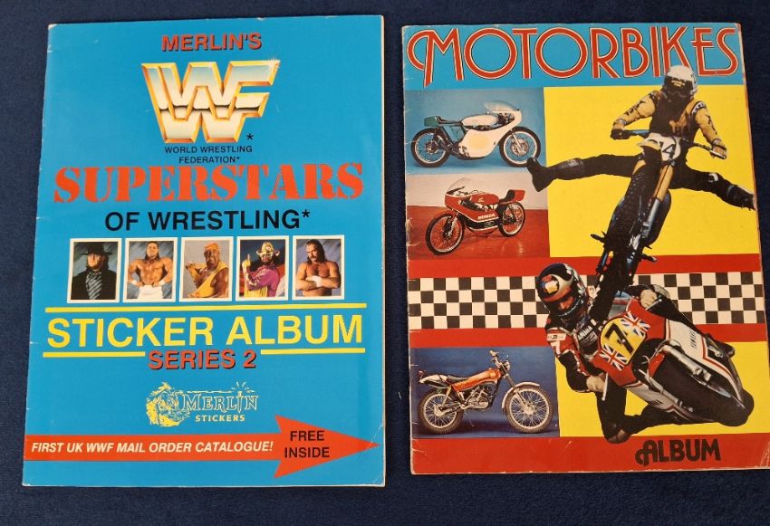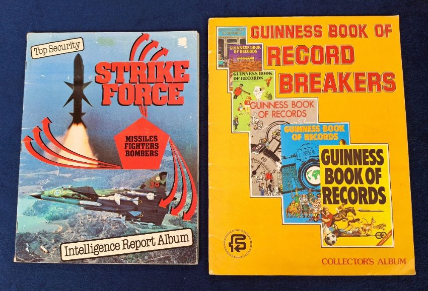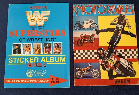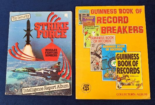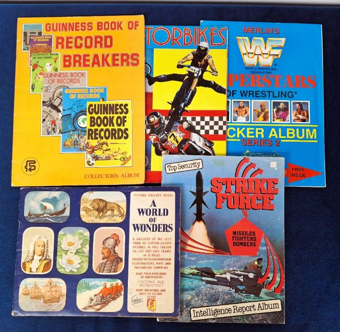Trade cards, 5 completed sticker albums, Flash (2, Motorbikes & Strike Force), Merlin WF Superstars 1991, Picture Gallery World of Wonders, FKS Guinness Record Breakers (gen gd, stickers stuck down in albums)