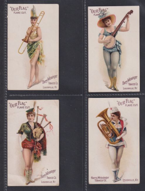 Cigarette cards, USA, Harry Weissinger Tobacco Co, Musical Instruments (Girls), 'X' size, 4 cards, ref. N286, pictures nos 7, 18 & 22, also Banjo card (gd) (4)