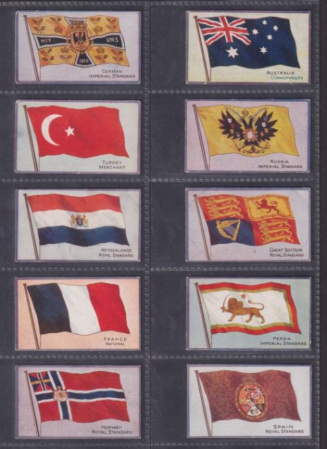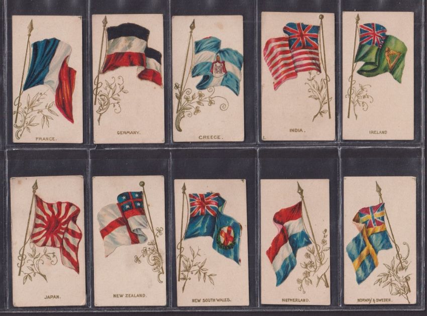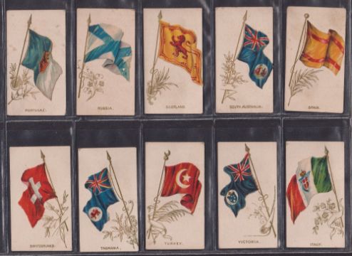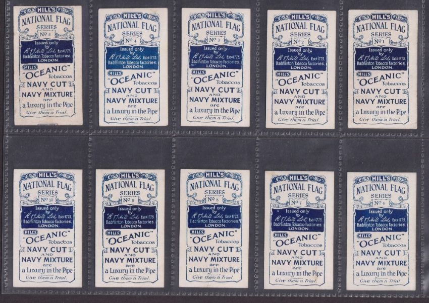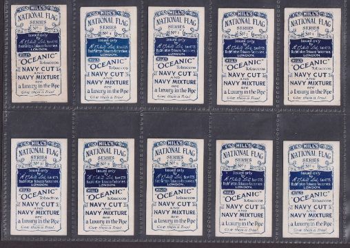 Cigarette cards, 2 sets RJ Hill National Flag Series (20 cards, gd), Cope Flags of Nations Series plain back (30 cards, fair/gd)