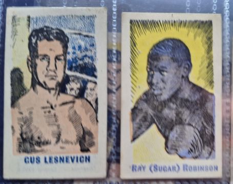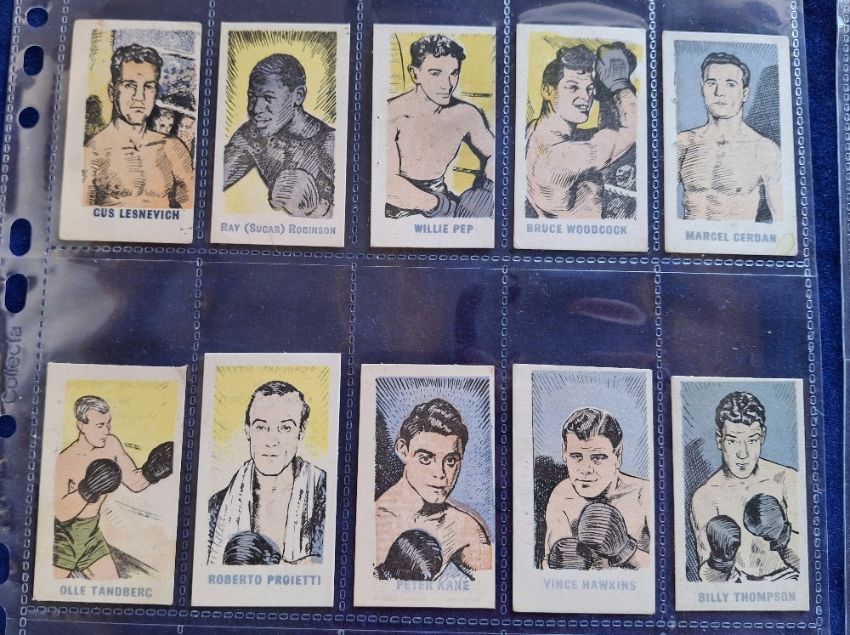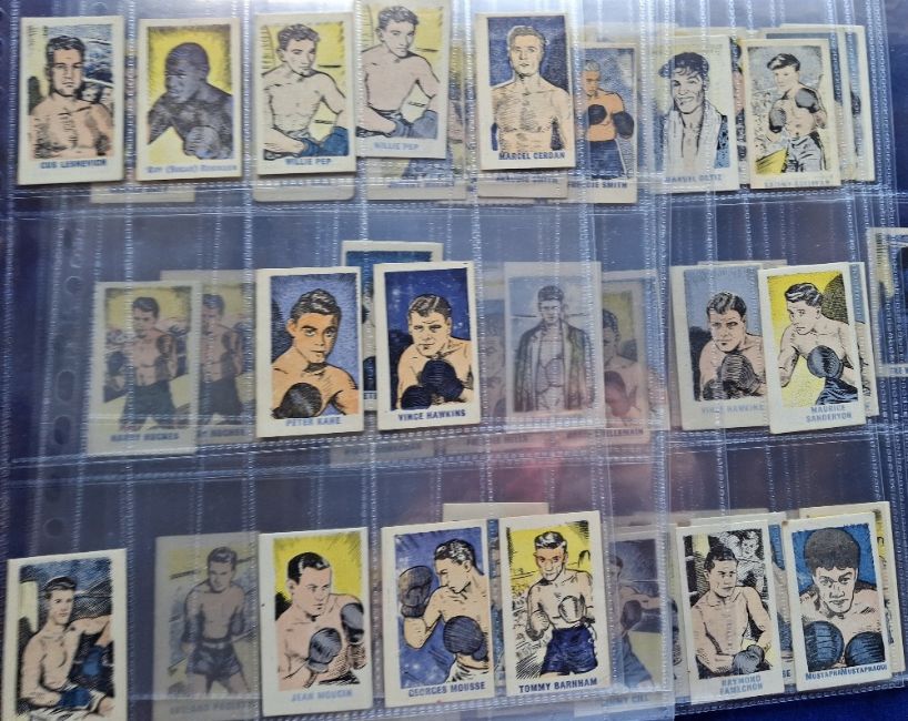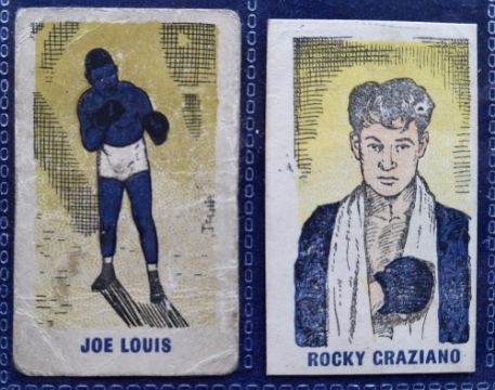 Trade cards, Kiddy's Favourites Popular Boxers, 73 cards, all with blue titles on the front not a complete set, approx. 30 different includes Sugar Ray Robinson (2), Joe Louis (1 but only fair) Rocky Graziano (3) etc (staple holes as issued and some variation in size, otherwise gen gd)