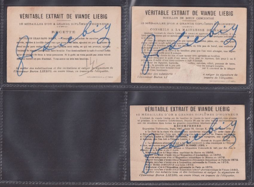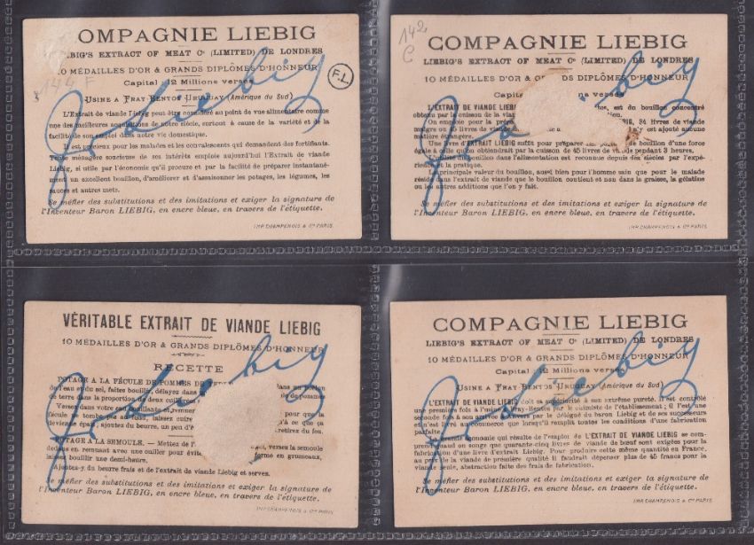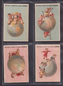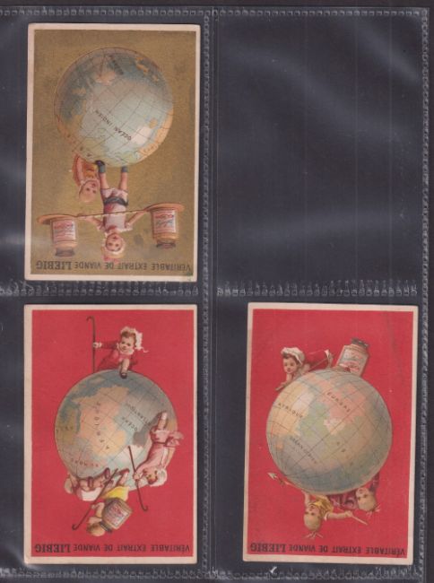 Trade cards, Liebig, 7 odd cards all "Children on Globes" French Language, 1 card S141 Gold background (slight staining on back), 2 cards S142 Blue background, (1 with back damage, 1 near gd), 2 cards S143 Red background (1 with back damage, 1 with slight back staining, near gd), 2 cards S144 Pink background (both with back damage) (fronts gen near gd, backs as described above)