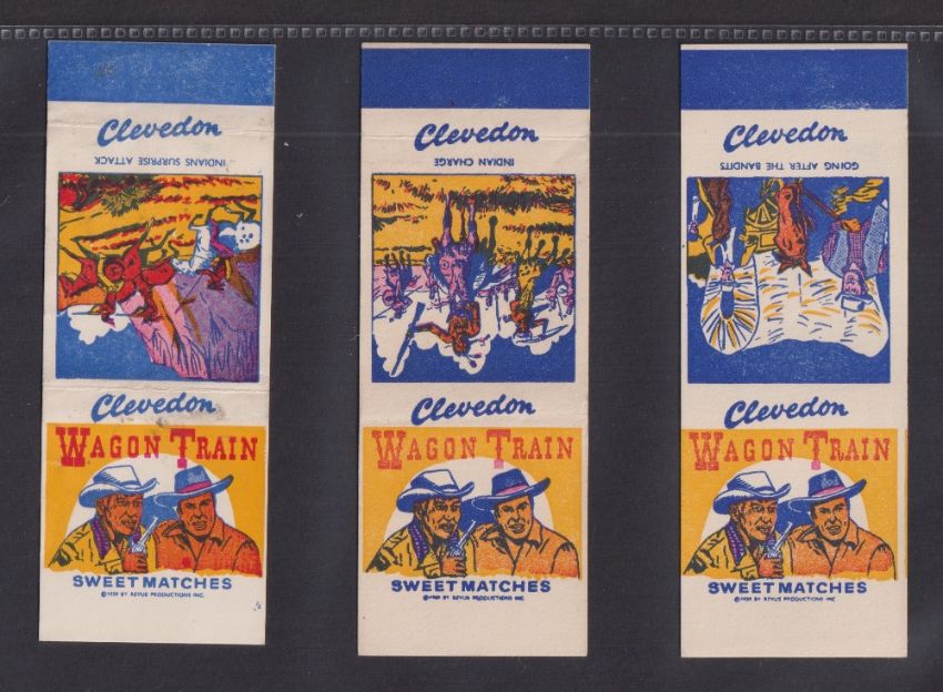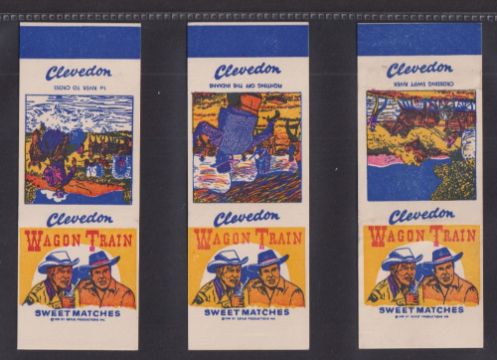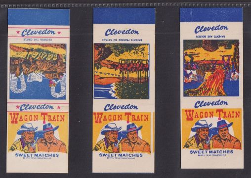 Trade cards, Clevedon Confectionery Wagon Train Western Series, 48/60 uncut Sweet Matchbook package issue cards measuring 124 x 47mm approx. (slight red marks on some backs, otherwise gd/vg)