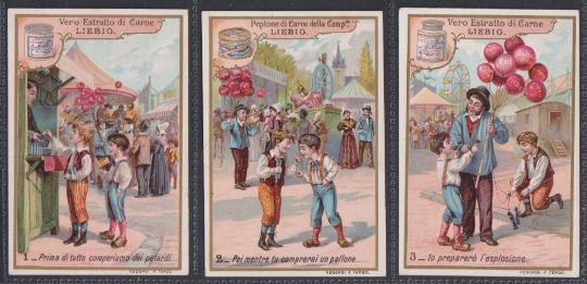 Trade cards, Liebig, three sets, Fireworks & Balloons at the Fair, ref. S565, Musical Instruments II ref. S561, both Italian editions and Balloons ref. S610, German edition (vg) (18)