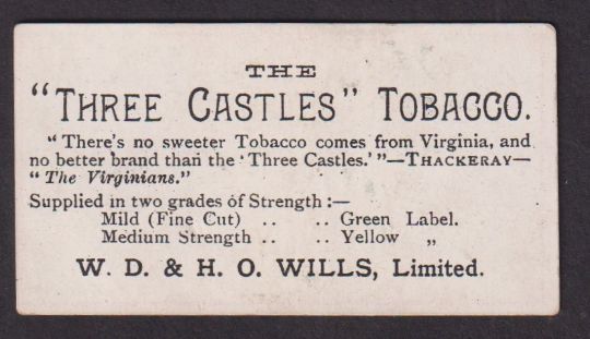 Cigarette card, Wills, Advertisement Card, three men on deck of ship, 'There's no sweeter Tobacco…...', with 'Three Castles' Tobacco advert to back (gd) (1)