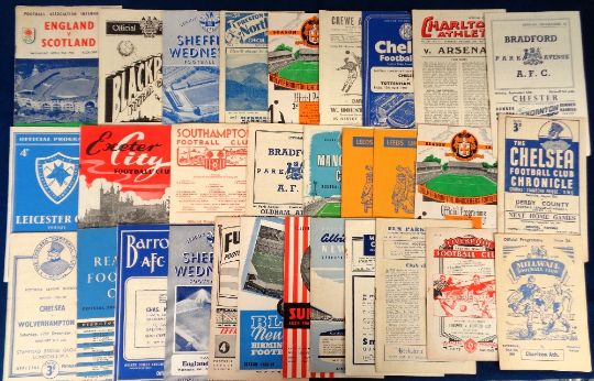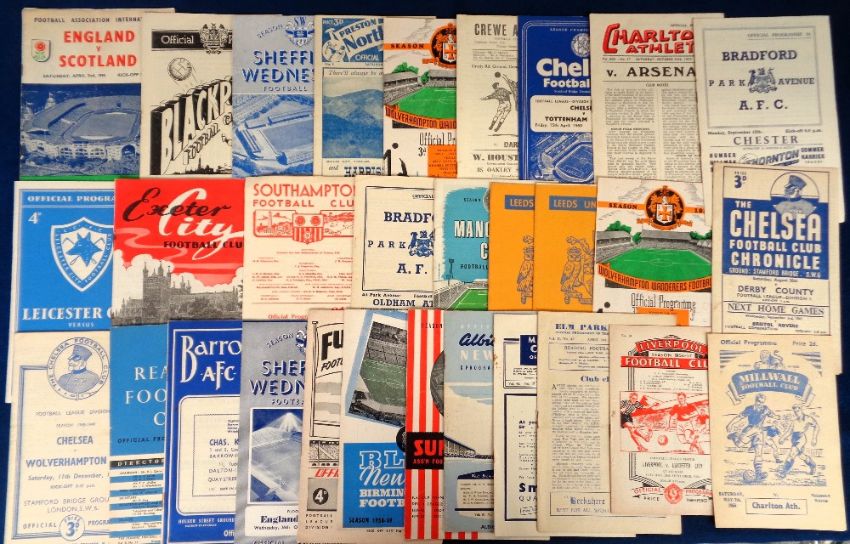 Football programmes, a collection of thirty 1940/50's programmes, a good selection inc. Manchester City v Blackpool 48/49, Reading v Port Vale 47/48, Millwall v Charlton Fr. 54/55, Chelsea v Derby 47/48, Liverpool v Leicester 56/57, Bradford PA v Chester 55/56 etc (some with team changes and scores noted gen gd)
