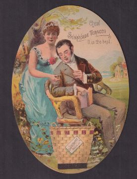 Tobacco advertising, USA, Buchner & Co, large oval shaped shop display advert for Sunnyside Chewing Tobacco, illustrated by courting couple, approx. 250mm x 170mm (vg) (1)