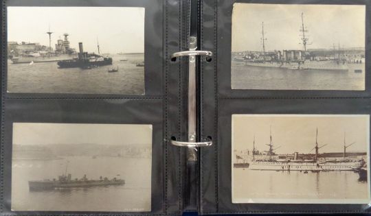 Postcards, a collection of approx. 100 mainly naval shipping cards and photographs in modern album, with many in Malta Harbour. Includes HMS Aboukir, Duncan, Oxley (Sub), Venetia, Emperor of India, Swallow, Albermarle, Bacchante, Bulwark, Formidable, Queen, Implacable, Venerable (mixed condition)