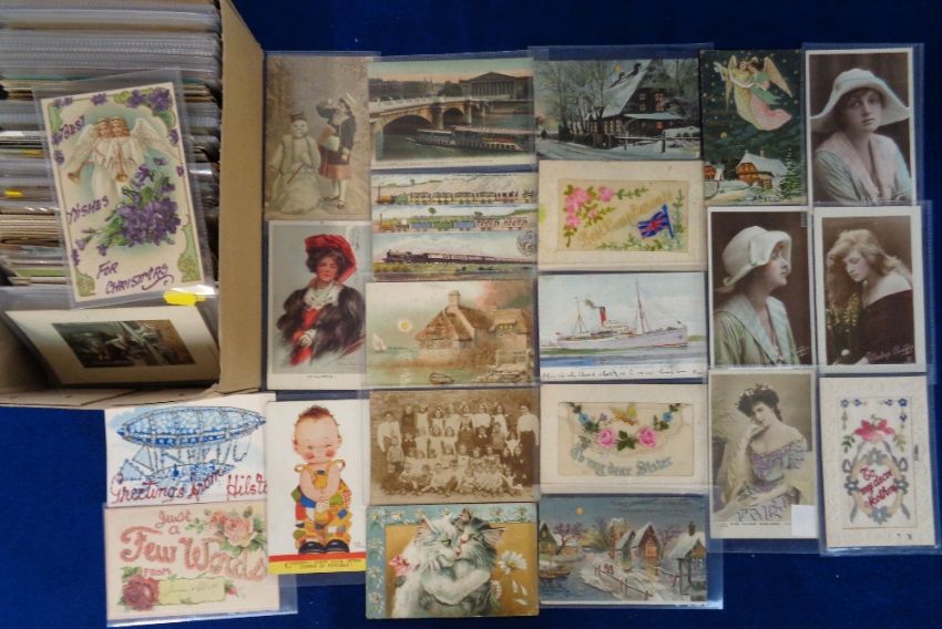 Postcards, Greetings, approx. 500 cards to include silk, glitter, embossed, shipping, comic, birds, hold to light (3), cats, Gladys Cooper, theatrical, WW1 romantic, Boileau (a/f), L&NWRC (1), Mabel Lucie Attwell and more (mixed condition, gen gd)