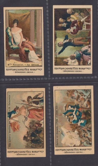Cigarette cards, China, The Egyptian Cigarettes Manufacturing Co, Shanghai, Old Masters (Brown Back), four cards, Mrs Recamier by Gerard, Rouget de Lisle Singing, The Liberty leading the People and Battle of Denain 1712 (gd) (4)