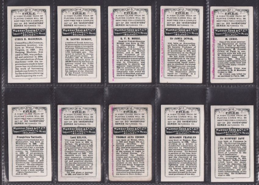 Cigarette cards, Murray Inventors Series (set 20 cards) (12 cards have red rubber stamp slogan down side of card on back, otherwise gd)
