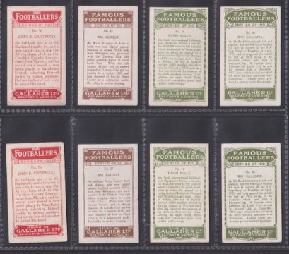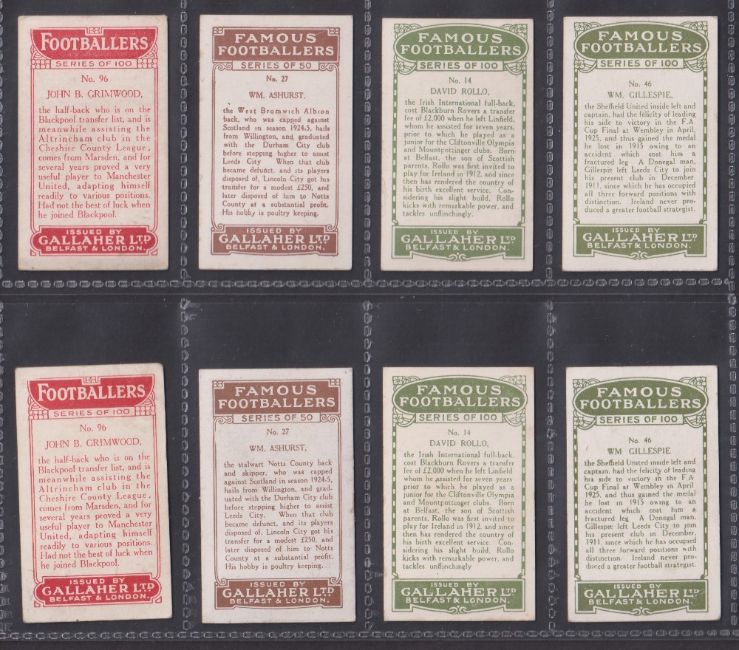 Cigarette cards, Gallaher, four pairs of variety cards, Famous Footballers (Green Back), two pairs of different cards for no 14 Rollo, Blackburn & no 46 Gillespie Sheffield United, Famous Footballers (Brown back) two different cards for no 27 Ashurst, one states West Bromwich Albion, the other Notts County and Footballers (51-100) two different cards for no 96 Grimwood of Blackpool (gd) (8)