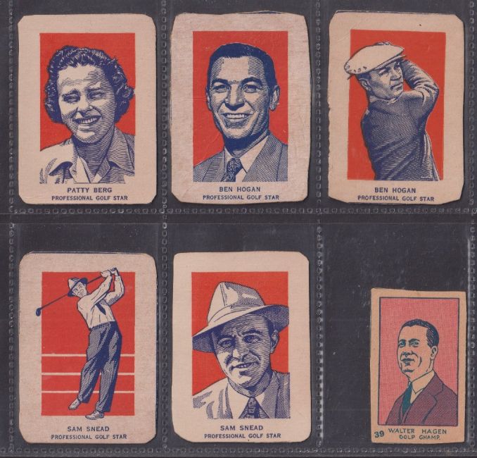Trade cards, Anonymous Unbranded series, 6 cards, all Golfers, L/M sized (5 including Ben Hogan, Sam Snead), plus 1 standard sized Walter Hagen number 39 (all irregularly cut)