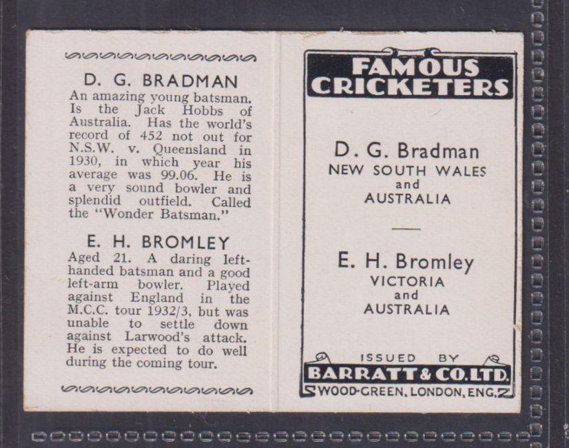 Trade card, Barratt Famous Cricketers 1934 folder type card, Donald Bradman / E Bromley (gd)