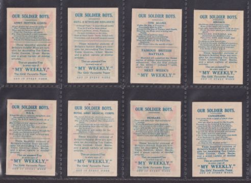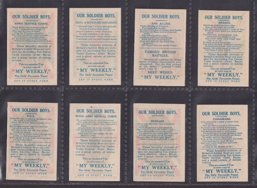 Trade silks, 4 sets My Weekly (3), Our Soldier Boys, Battle Series, Soldiers of the King, plus Sunday Stories The King & His Soldiers (all with original backs gen about gd)
