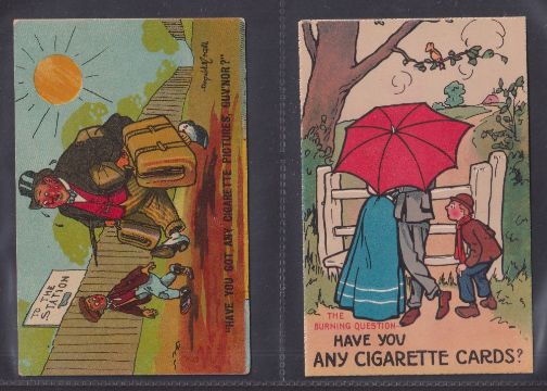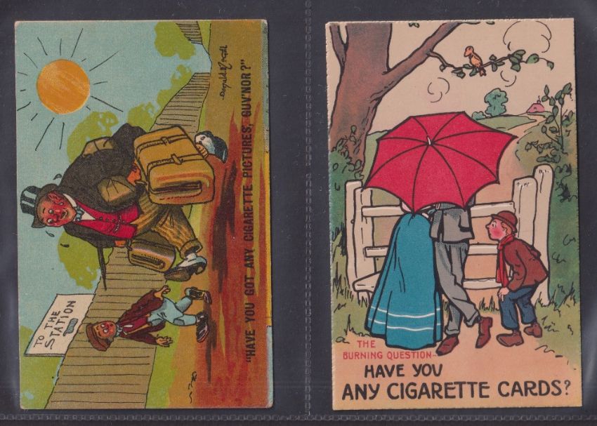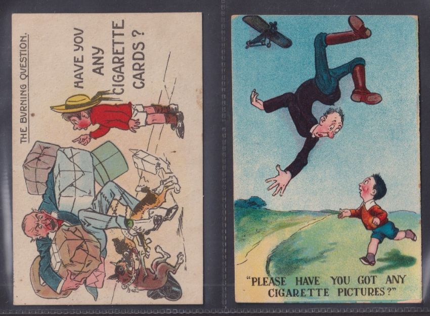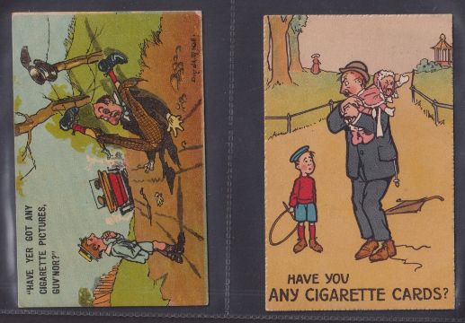 Cigarette Postcards, 8 postcards, 6 of which are 'Have you any Cigarette cards', the other 2 are closely related to the theme (3 postally used, 3 written on the back not posted and 2 not used, otherwise fair to mainly gd)