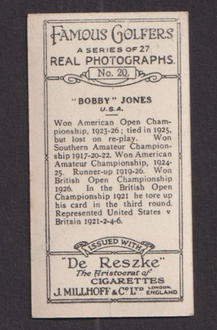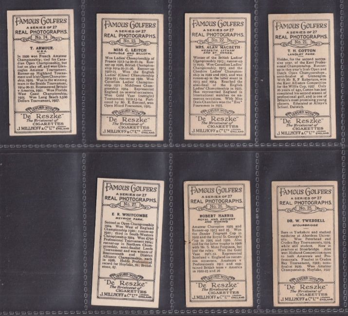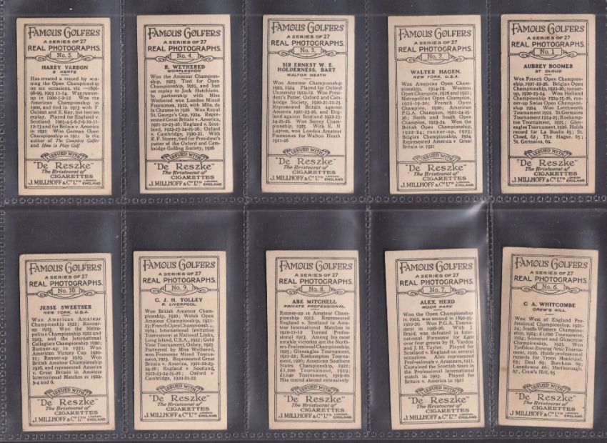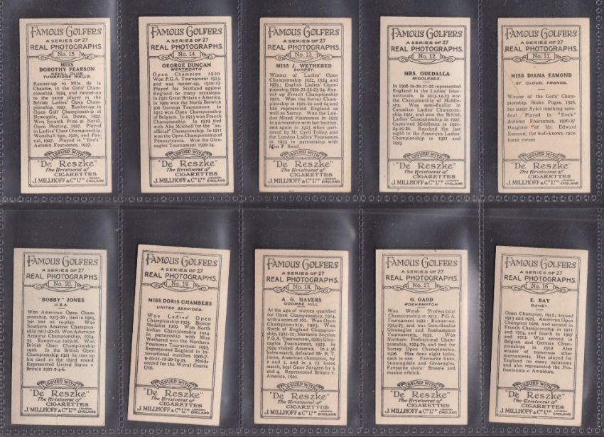 Cigarette cards, Millhoff Famous Golfers (set 27 cards) includes Bobby Jones, Harry Vardon, Walter Hagen etc (gen gd/vg)
