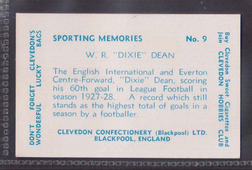 Trade card, Clevedon Confectionery, Sporting Memories XL sized type card blue back, no. 9 Dixie Dean, Footballer (gd)