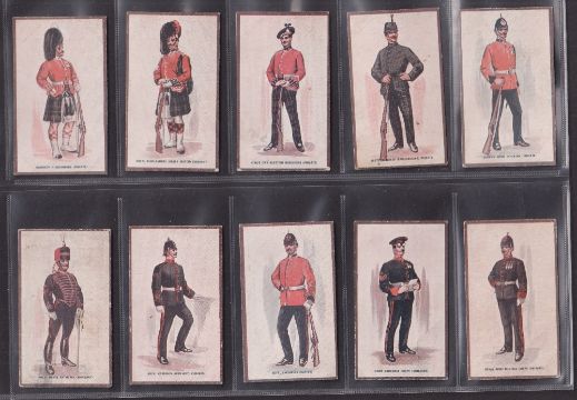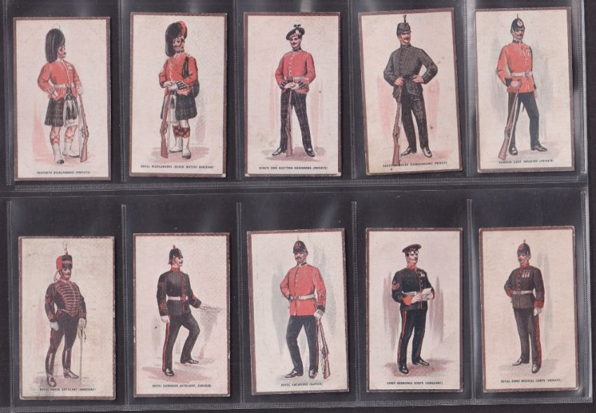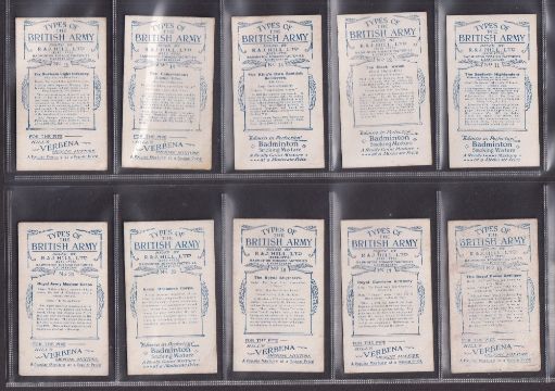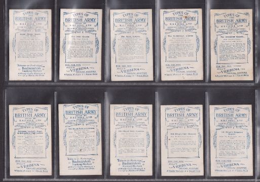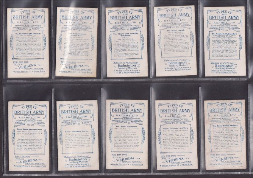 Cigarette cards, RJ Hill, Types of the British Army (set 20 cards, 13 with 'Verbena' backs and 7 with 'Badminton' backs) (a few fair gen gd)