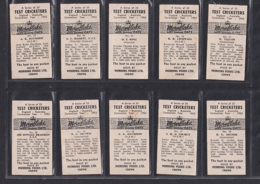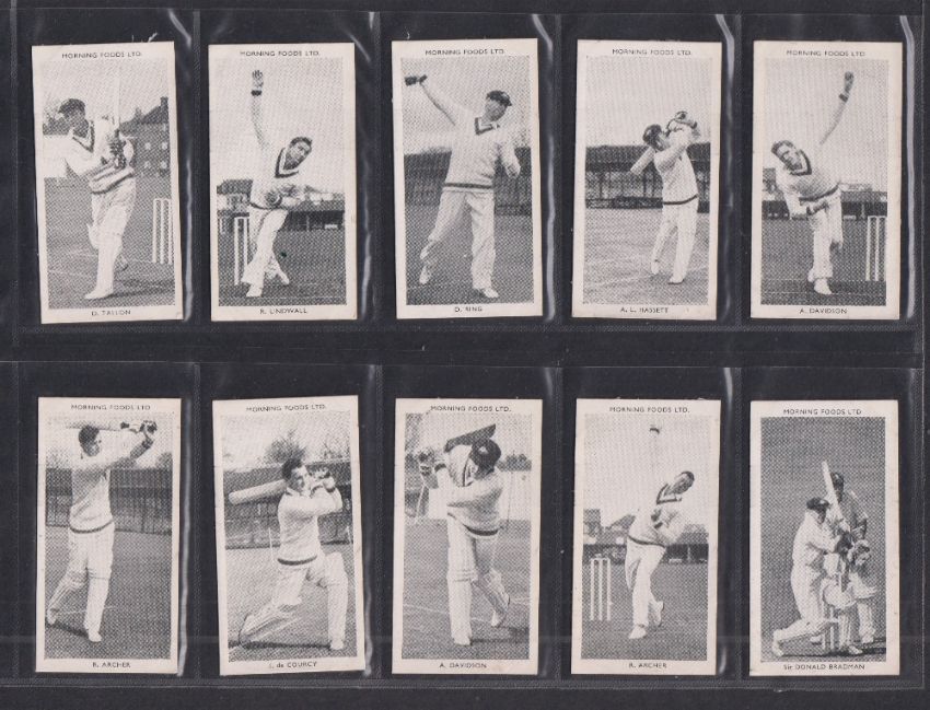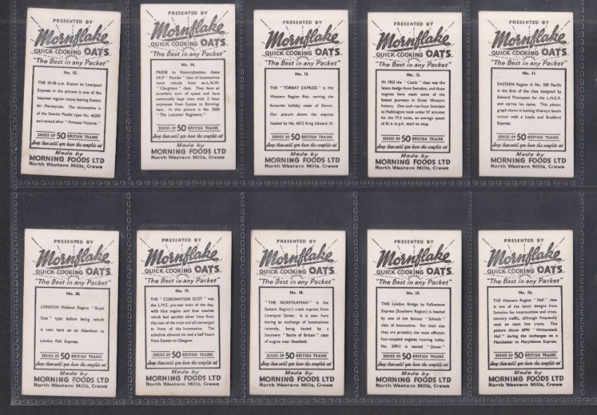 Trade cards, Morning Foods, 2 sets British Trains (50 cards, 5 cards fair/near gd rest gd/better) Test Cricketers including Donald Bradman (25 cards, some with slight foxing, gen gd)