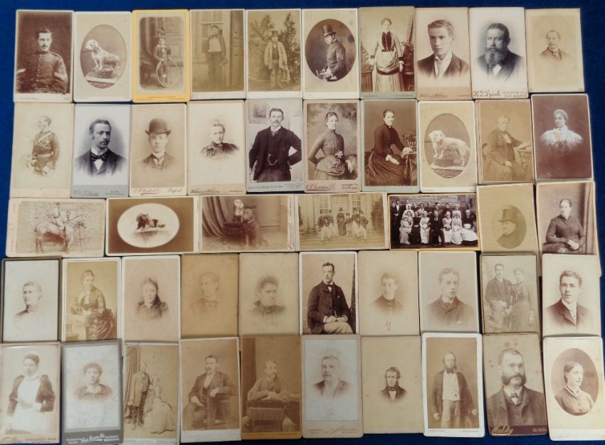 Cartes de Visite, approx. 170 interesting cards that have mainly been collected for their variety of photograph studios. Several countries represented to include UK, Ireland, India, France, Canada, Australia and Malta. Subjects include country house servant group (1), boy with hoop, clergy, polo players, military, dogs, hunting dress, gamekeeper, builder etc. (mixed condition fair to gd)
