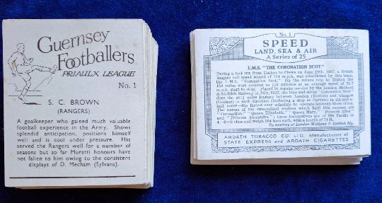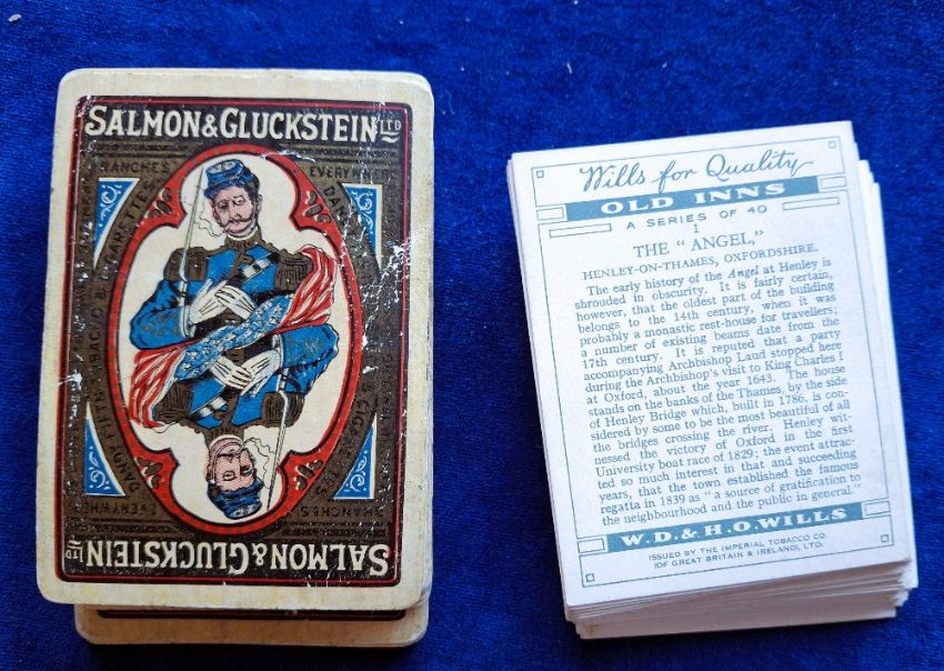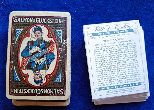 Cigarette cards, collection of a few hundred cigarette cards, mainly larger sized in box, including 3 sets BAT Guernsey Footballers Priaulx League, Wills Old Inns 1st series, Ardath Speed Land Sea & Air, part / near sets include Millhoff Roses, Carreras Famous Escapes, etc, plus many odds including Ogden's Guinea Golds, Wills British Empire P size, Ardath Photocards etc, sold with a complete deck of playing cards with Salmon & Gluckstein advert on back (fair only) (fair/gd many gd unless stated above)