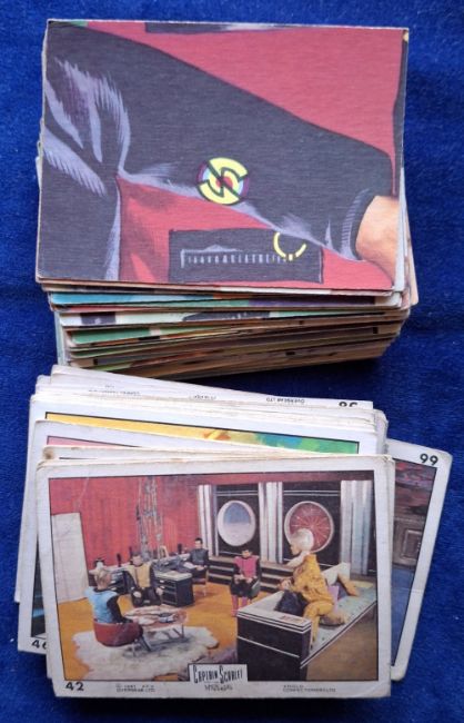 Trade cards, Selection Toffee Trefin Embarquement en Europe (set 48 cards, P size), Anglo Captain Scarlet (set 66 cards), Anglo Tarzan 64/66 (missing 52 & 53), A&BC Gum Flags of the World M sized (set 80 cards some with writing on the backs), A&BC Gum Man from UNCLE (set 55 cards, gd) (gen fair/gd unless stated above)