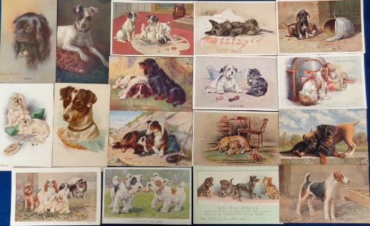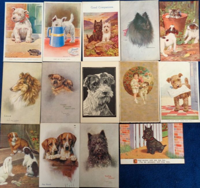 Postcards, Dogs, a selection of approx. 31 illustrated cards of dogs. Artists include Watson (4), L.E.D, Tye, Briggs, Fialkourta, Lumley, Wardle, Cobbe, Valter (4), Mac, Gear, Drummond, Keane. Breeds include Daschund, Collie, Maltese, Scottie, Scots Terrier, Griffon, Toy Spaniel, Pekinese, Stag Hounds, Wire Fox Terrier, Pomeranian etc (mainly gd)