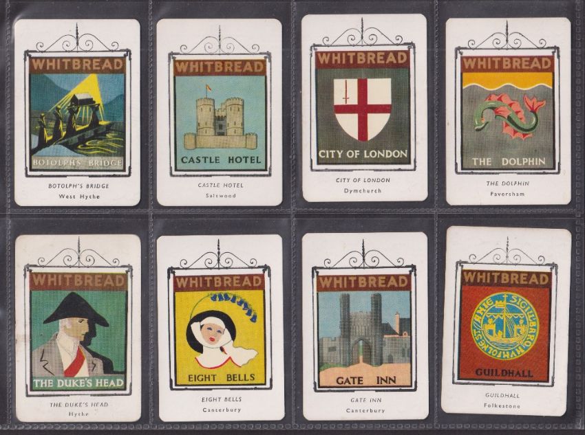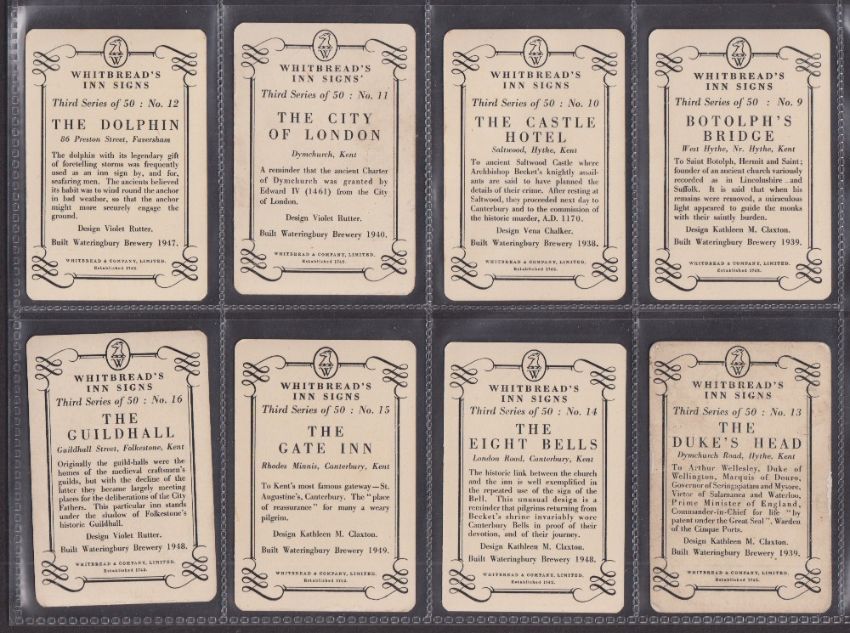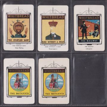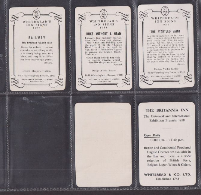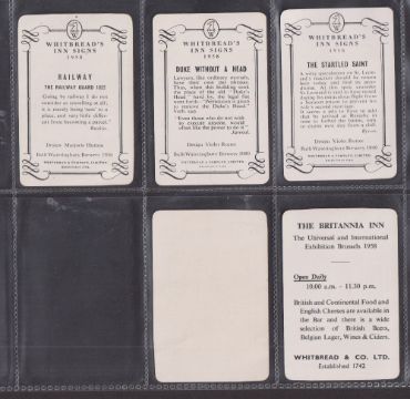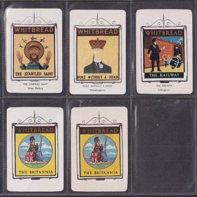 Trade cards, Whitbread Inn Signs 3rd Series, card version (set 50 cards), plus 5 special issues Startled Saint, Duke Without a Head, Railway, Britannia Inn (printed) & Britannia Inn (plain back) (gd)
