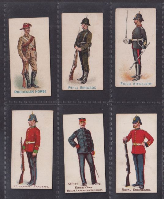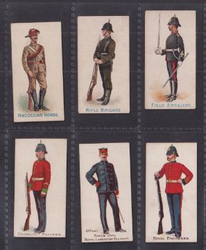 Cigarette cards, Cohen Weenen Home & Colonial Regiments (100 backs), 16 cards, 13 with blue captions & 3 with brown captions (blue captions gen gd, brown captions fair/near gd)
