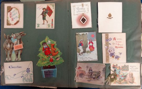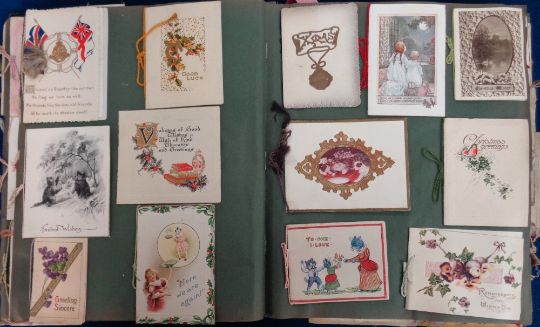 Ephemera, Greetings Cards, an album of 250+ laid down cards dating to WW1 and earlier. Embossed, glitter, ribbons, die-cut etc. Subjects include Father Christmas, children, cats (1 Louis Wain), gollies, ships, wartime motifs, comic etc. (album poor, contents gd)