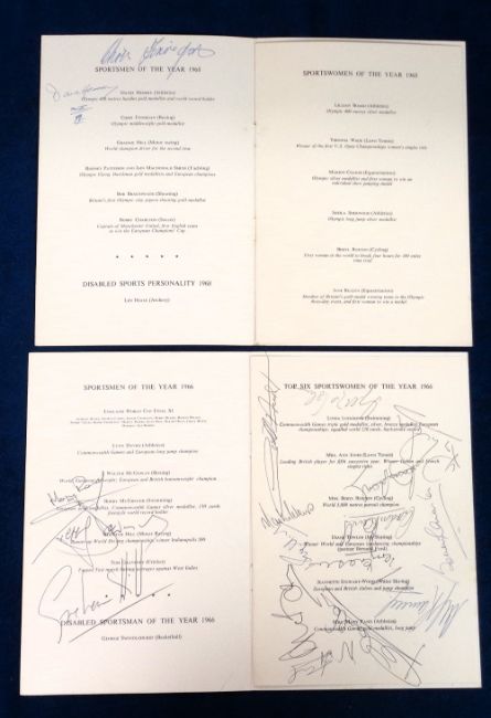 Sports autographs, two SWA (Sports Writers Association) Annual Sportsman of the Year Menu cards, both held at Café Royal, London, 1966 & 1968, 1966 with multiple signatures inc. The England World Cup Winning side (12), inc. Bobby Moore, Martin Peters, Geoff Hurst, Bobby Charlton etc also signed by Graham Hill, Terry Downes, & Mary Rand, the 1968 card has two signatures, David Hemery & Chris Finnegan (gd)