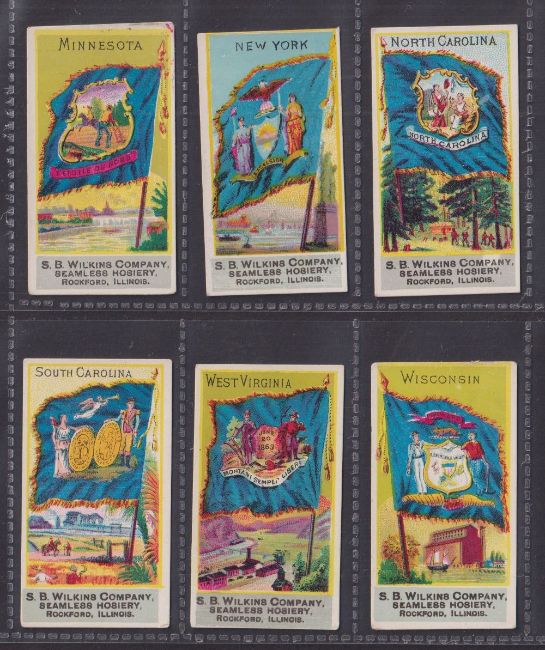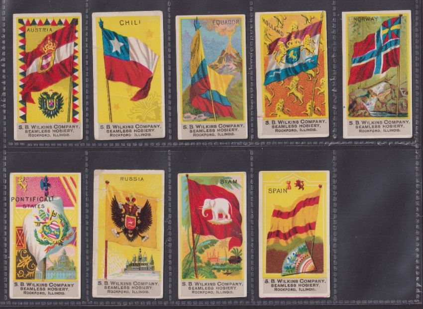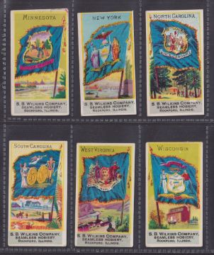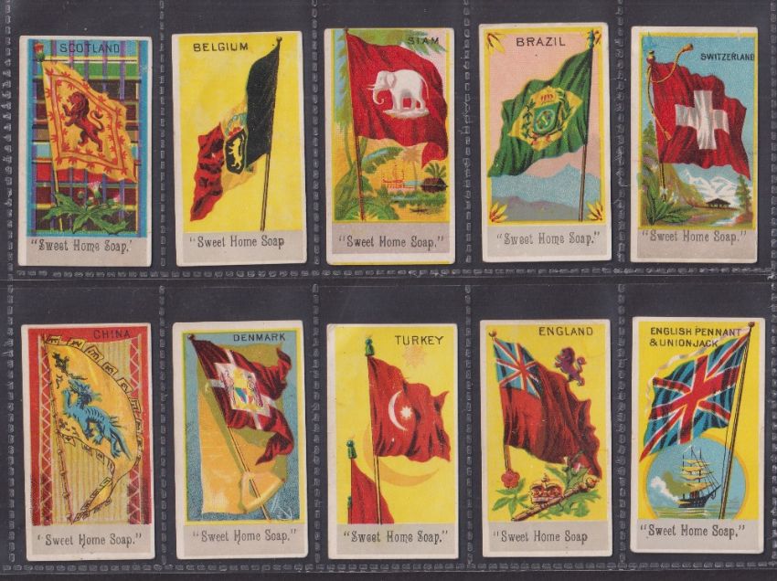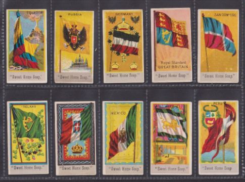 Trade cards, USA, 35 Flag related cards from 2 issuers, all with plain backs, SB Wilkins Flags of all Nations (9), SB Wilkins US State Flags (6), Sweet Home Soap Flags of all Nations (20) (mixed gen fair/gd)