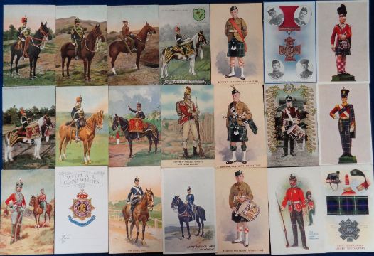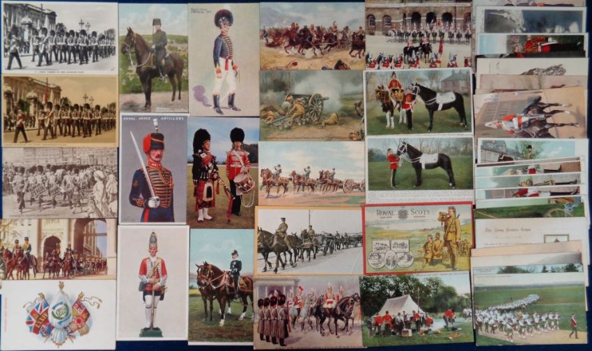 Postcards, Military, a military mix of approx. 65 cards, mostly Coldstream Guards, Scots Guards, and Life Guards, with soldiers in uniform, or on horseback. Mostly coloured cards from a range of different series, with EFA, Valentines, Knight, Ettinger etc. Also Drum Horse (Kings Royal Irish Hussars), ASC, Silver Drums, Troopers, trombone player, bandsman, Corporal Major (all 1st Life Guards), VC (from London Gazette). Nice mix, viewing recommended (mainly gd)