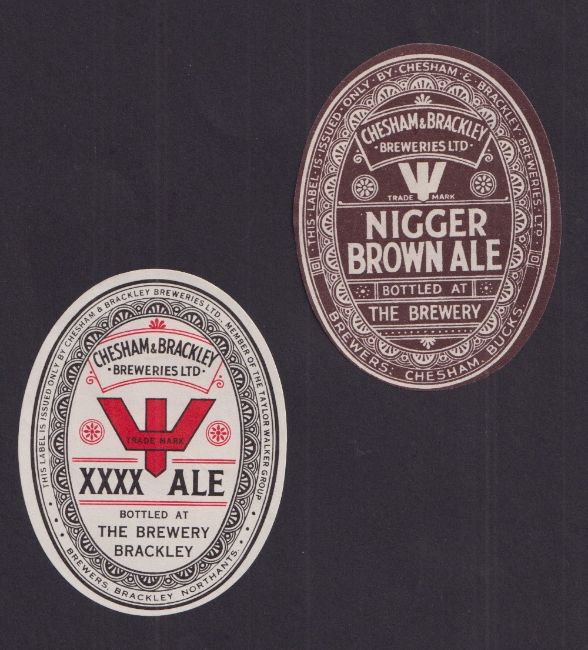Beer labels, Chesham & Brackley Breweries Ltd, two vertical oval labels, approx. 84mm high, one for Nigger Brown Ale & the other for XXXX Ale ( gen gd one with hinge) (2)