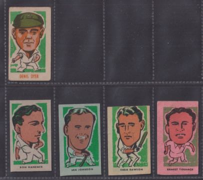 Trade cards, Kiddy's Favourites Popular Cricketers, 15 cards, Grey card (11) plus one each on pink, dark grey, blue & olive coloured cards (usual uneven cut and sizing, otherwise gen gd)