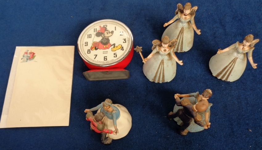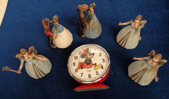 Toys, 3 Wells Fairy Queen wind up toys (1 complete, 2 damaged), a Wells Brimtoy Cinderella and Prince Charming wind up toy and 1 other together with a Bayard Mickey Mouse alarm clock and 3 sheets of vintage Walt Disney writing paper (fair/gd) (9)