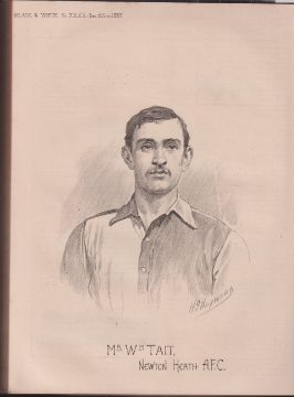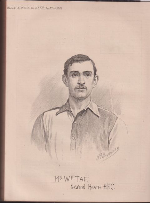 Magazine, 'Black & White', An illustrated, Manchester published, weekly paper, 1887/1888, launched to coincide with and celebrate Queen Victoria's Royal Golden Jubilee Exhibition at the White City, Manchester, bound in two volumes being a consecutive run of 40 issues from Vol 1, No 1, 29 April 1887 to issue 40, 27 January 1888, all with covers. Includes good football coverage with match reports, illustrations etc. Noted b/w artist drawn image of Mr Wm. Tait, Newton Heath with biography, believed to be the first Scottish player for Newton Heath and therefore Manchester United. Also covers numerous other sports as well as other non sporting current events of the time & with numerous adverts. Particularly good insight into the events & sports for the NW England. Other illustrations include Cricketers, Dr. W.G. Grace, John Briggs, Lord Harris etc, Rugby players Joseph Mills, H. Eagles both of Salford, Footballers J.J. Hawridge of Bradford City, N.J. & J. Ross of Preston North End etc and even including Buffalo Bill!. Bound in grey board with gilt lettering to spine. No copies known in any of the principal national libraries. (one cover loose, contents gd)