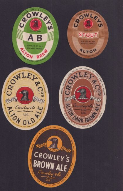 Beer labels, Crowley & Co Ltd, Alton, 5 vertical oval labels, Stout, 68mm high, (sl paper adhesion to back), AB, 80mm high (paper adhered to back), Brown Ale, Alton Dark Brown Ale, & Alton Old Ale (all approx. 86mm high) (gd) (5)