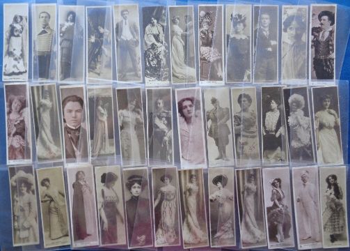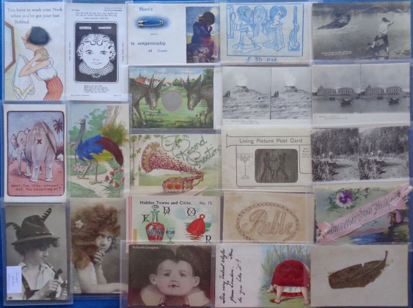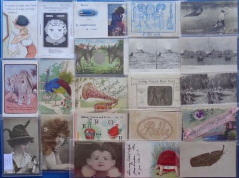 Postcards, Novelty, a mixed novelty selection of approx. 78 cards, with 38 bookmark cards of Edwardian actors and actresses. Other novelty cards include applique, stereo cards (LL Tonkin, 2), celluloid, puzzle caricature, living picture, fantasy, real hair, pin the tail, feathers, sparkle, mirror, safety pin, large veg etc (mixed condition)