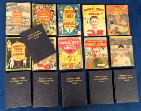 Topical Times Annuals, a collection of 16 Annuals, ten original soft back editions for 1930/31 - 1939/40 (most with faults to covers, fair/gd), sold with 6 professionally rebound editions for 1923/24 - 1925/26 inclusive (1926/27 never issued) and 1927/28 - 1929/30 inclusive, each one bound in blue board with gilt lettering to front and spine (vg)