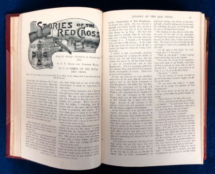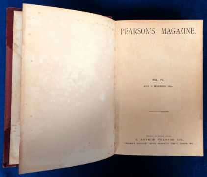 Book, Pearson's Magazine Vol IV July to December 1897 containing 6 sections of The War Of The Worlds by H.G. Wells, hard backed red boards with gilt tooled red leather spine (inner pages gd, boards and spine scuffed)