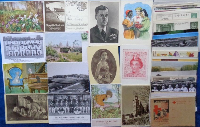 Postcards, a mixed collection of approx. 83 continental size cards inc. 'Free Czechoslovakia', 'Luz-and-Ara Acrobats' advert, Bruxelles Expo ad for 1935, 2 cartoon cards for 'OM's-PSE Don’t forget the German Hams (radio 1947), Vienna Congress 1946 (good stamp and postmark), advert for Southern Serenaders Dixie Days (black performers), anti malaria treatment advert?, also pre war German illustrated postal stationery inc. Hitler, 1936 P.U Olympics, International cricket teams, London Airport, frog, Indian cinema, Goodwood Race Course, aviation inc. Zeppelin and much more. Good artwork (mainly gd)