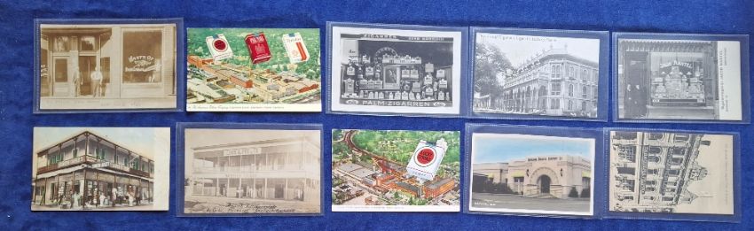 Tobacco advertising, a collection of 10 advertising postcards showing tobacco related shop fronts and factories from around the world inc. ATC Cigarette Plant, Durham North Carolina, Jacob Mantel Amsterdam, National Tobacco Co New Zealand, Louis A Pee & Co Honduras, etc (all unused, gen gd)